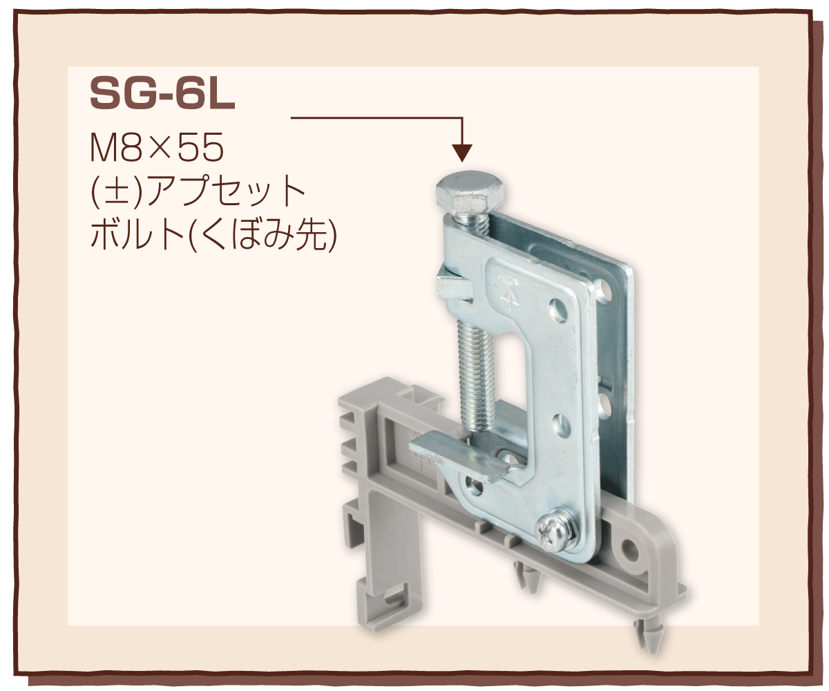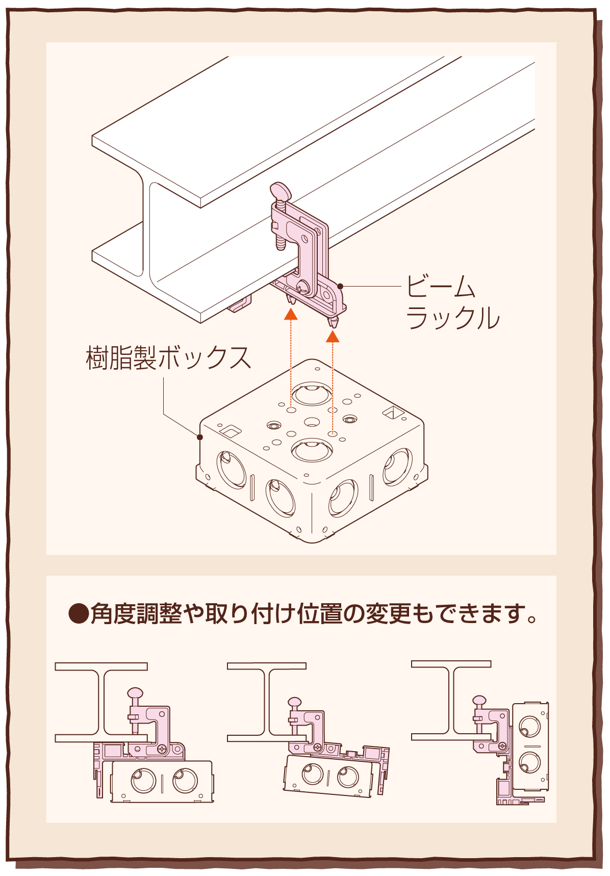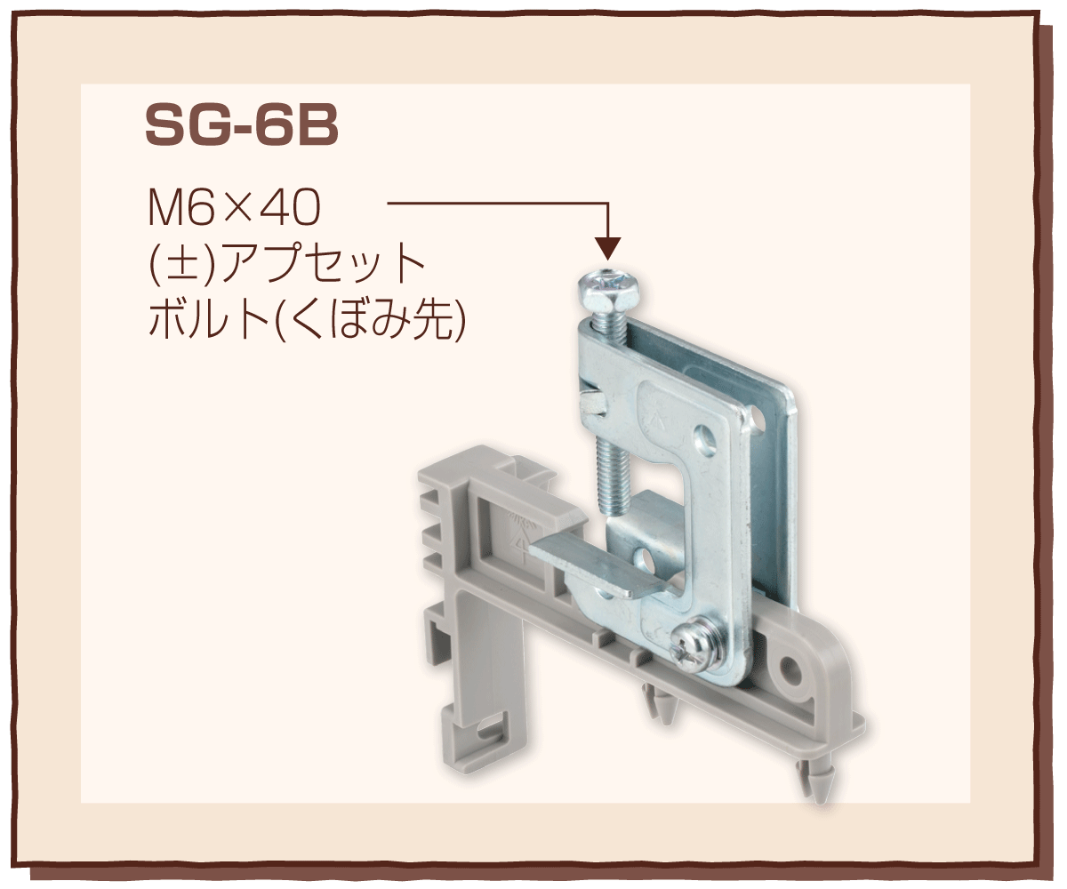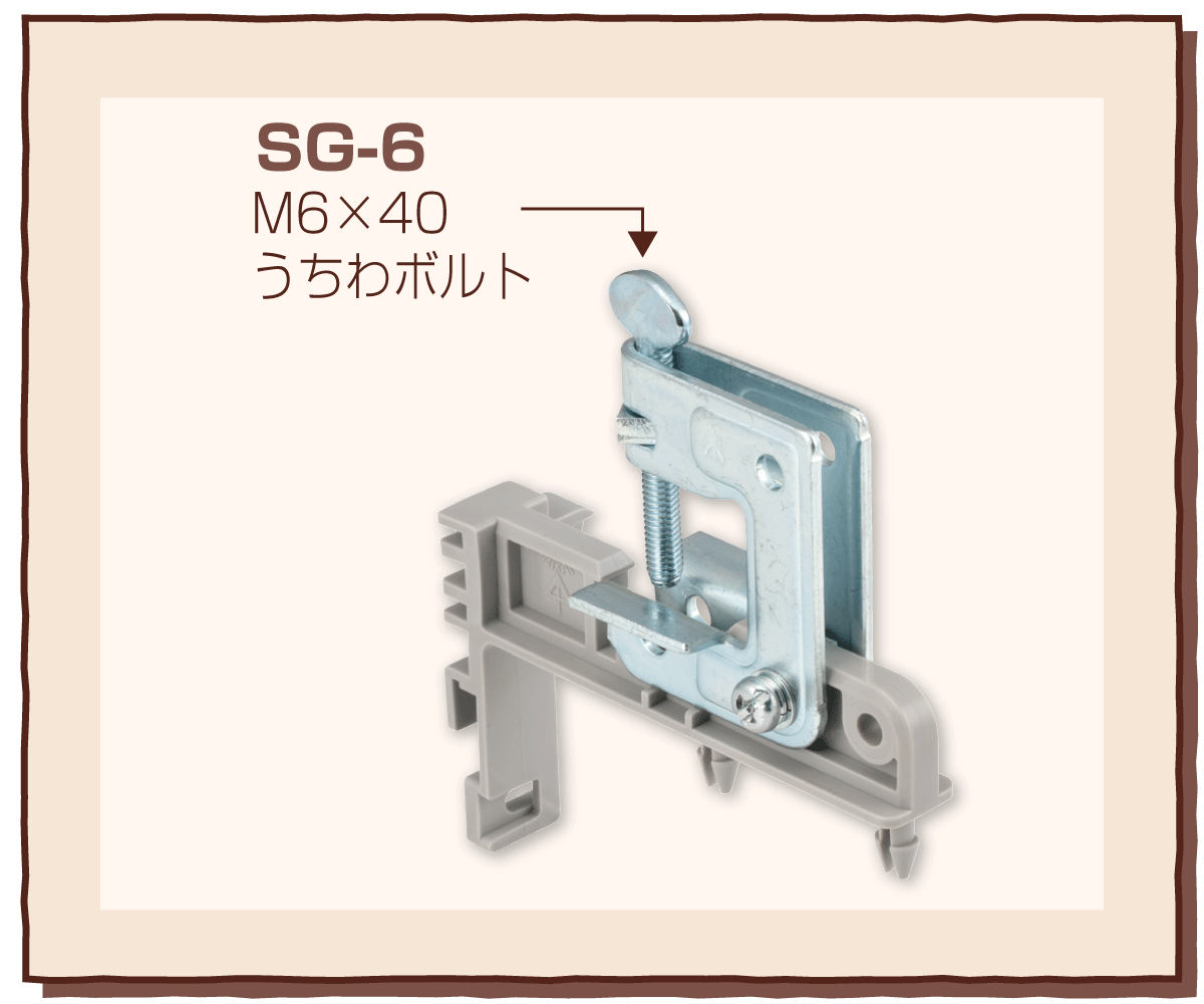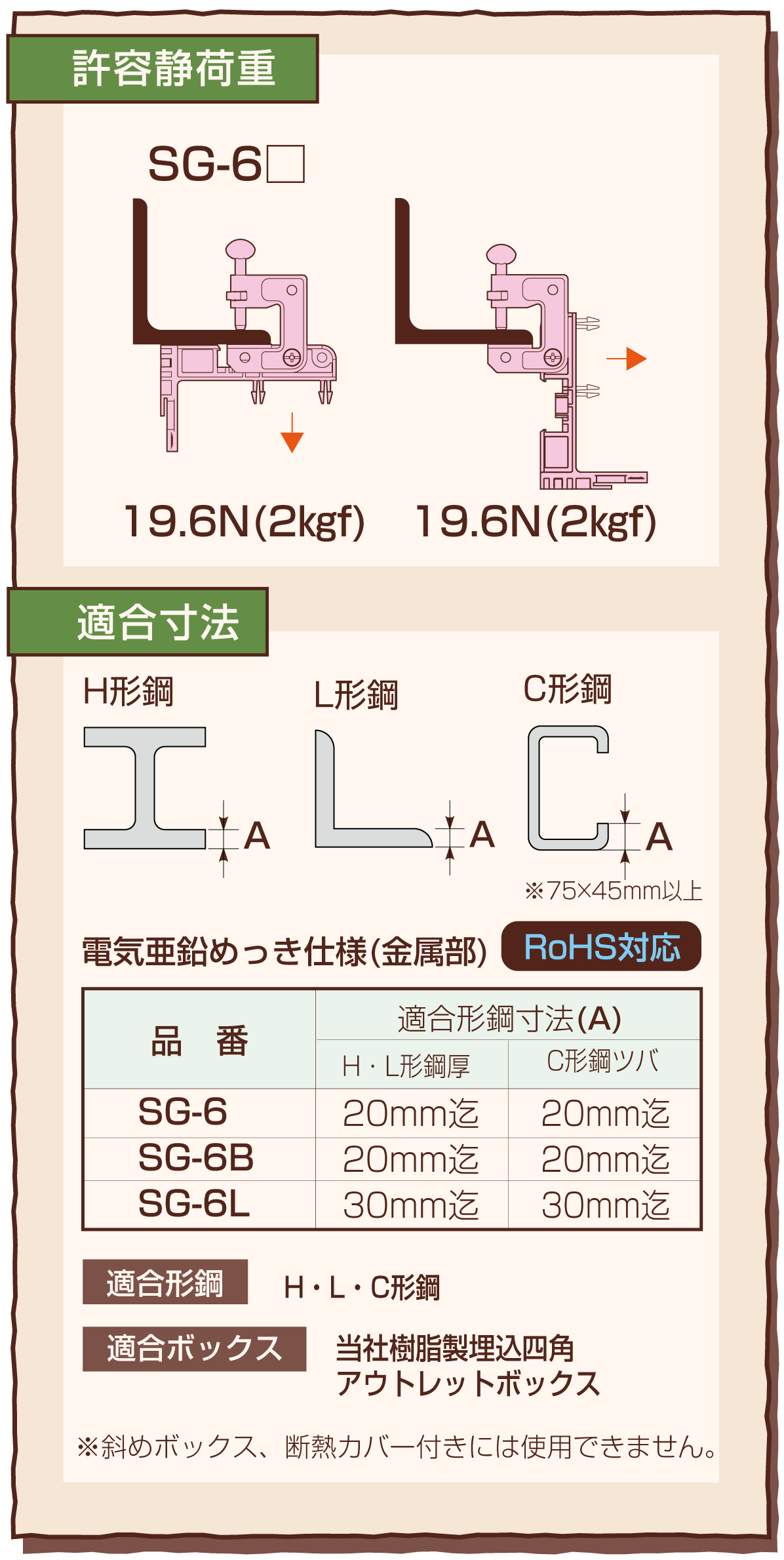 特 徴 樹脂製アウトレットボックスの底面穴をビームラックルの突起部(2ヶ所)に差し込み固定します。 品番 入数 SG-6 1 SG-6B 1 SG-6L 1 H・L・C形鋼用関連部材チラシ(PDF:656.0KB)
