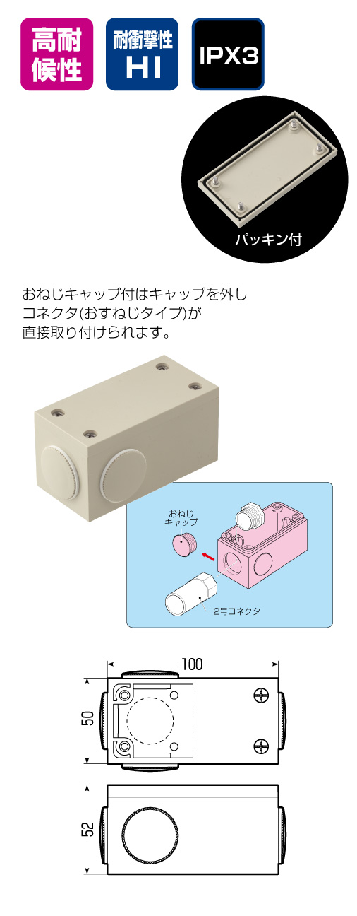 - 屋外での使用に便利な防雨型のユニバーサルボックスです。