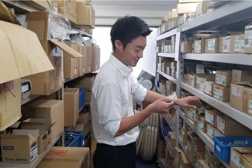 お客様からのご注文に対して製品を手配すること、またそれにともなう入出庫管理や伝票処理を行うのが私の主な仕事。営業担当や物流担当、協力工場などの関係各所と連携しながら、在庫を常に最適化するいわば裏方です。目立たないけれど、お客様と未来工業の信頼関係を支える「縁の下の力持ち」と言えるかもしれません。